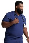 This flattering and functional men's fit V-neck top offers rib knit insert at neck, side rib knit panels for lasting comfort and shoulder yokes with a bungee loop to hold your i.d. badge at wearer's right side.